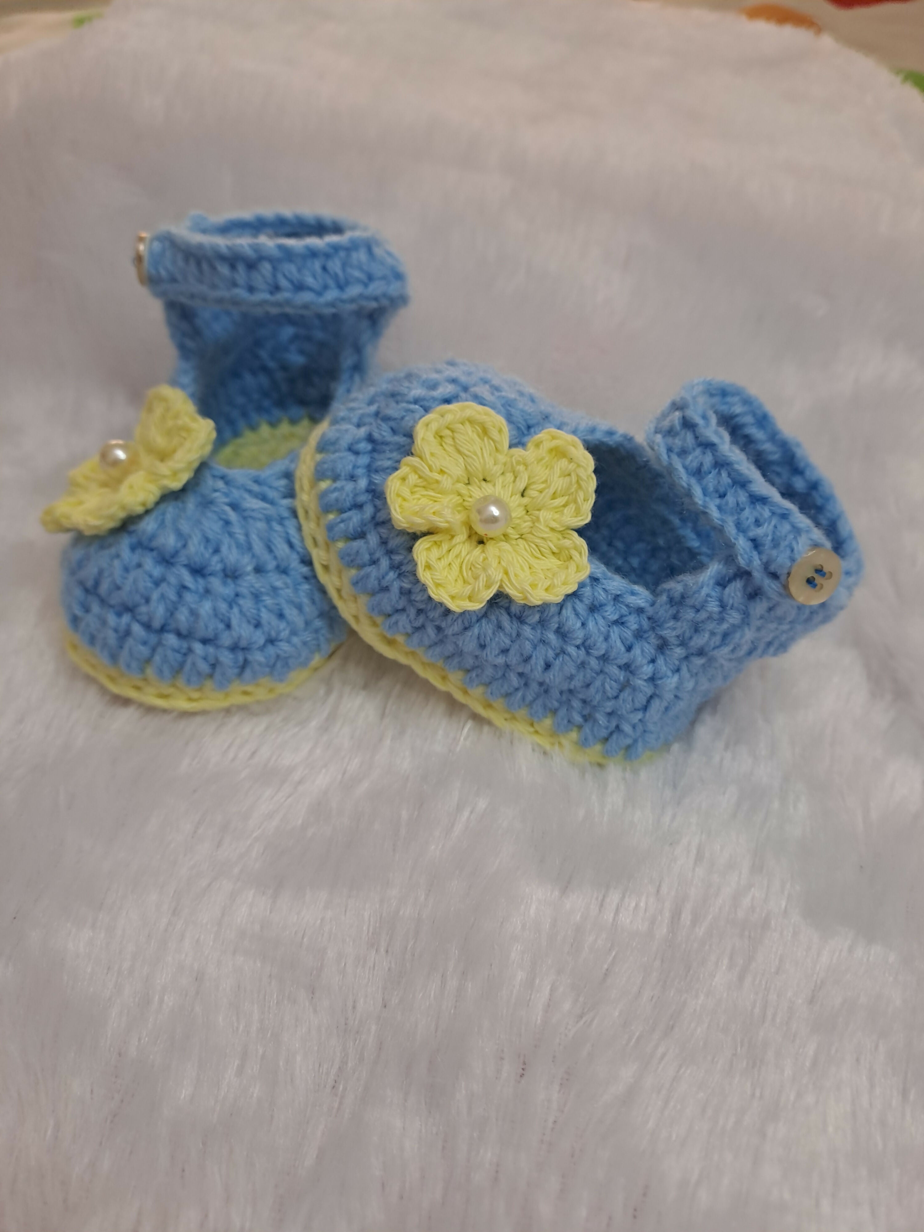 Expertly hand-crafted, these crochet baby booties are adorned with delicate flower details. Made with soft, high-quality yarn, they will keep your baby's feet warm and comfortable while also adding a charming touch to their outfit. Perfect for any occasion, these booties are a must-have for any stylish baby.